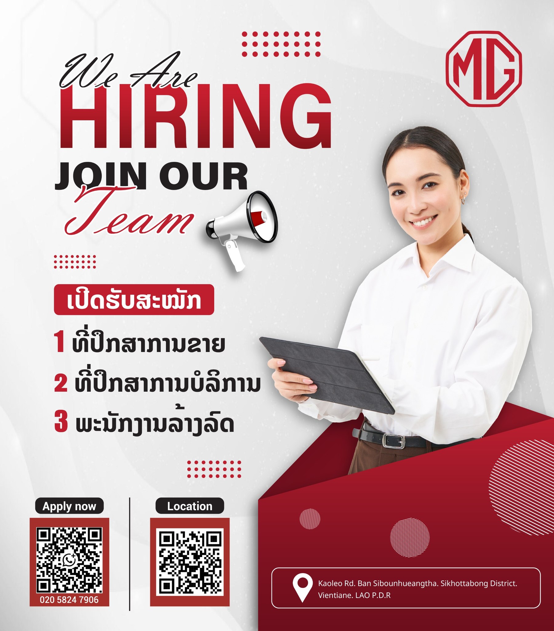 🚗 #ມາຮ່ວມເຕີບໂຕໄປພ້ອມໆກັນກັບMG 🔧 ເປີດຮັບສະໝັກວຽກໃນນະຄອນຫຼວງວຽງຈັນຫຼາຍຕຳແໜ່ງ. ສະໝັກດຽວນີ້! ✅ທີ່ປຶກສາການຂາຍ ✅ທີ່ປຶກສາການບໍລິການ ✅ພະນັກງານລ້າງລົດ 👉 ທ່ານສາມາດສົ່ງ CV ຂອງທ່ານໄດ້ທີ່ 020 59999416, 020 58247906 #ເປັນຫຍັງຕ້ອງສະໝັກວຽກກັບMG MG ເປັນບໍລິສັດ ຂອງ ຄົນລາວ ເຮັດວຽກຮ່ວມກັບຜູ້ຊ່ຽວຊານສະເພາະດ້ານທີ່ຄອຍໃຫ້ຄຳປຶກສາ ແລະ ຝຶກອົບຮົມໃຫ້ເປັນປະຈຳ, ມີແຜນການຝຶກອົບຮົມຍົກລະດັບຄວາມຮູ້ຄວາມສາມາດ ແລະ ວາງແຜນວຽກທີ່ຊັດເຈນ ເພື່ອຮັບປະກັນການປະຕິບັດວຽກງານເພື່ອໃຫ້ຕອບໂຈດກັບສະພາບການແຂງຂັນທີ່ສູງ, ມີສະຫວັດດີການທີ່ເໝາະສົມ ແລະ ເງິນເດືອນໝັ້ນຄົງອີງຕາມສະພາບເສດຖະກິດ.
